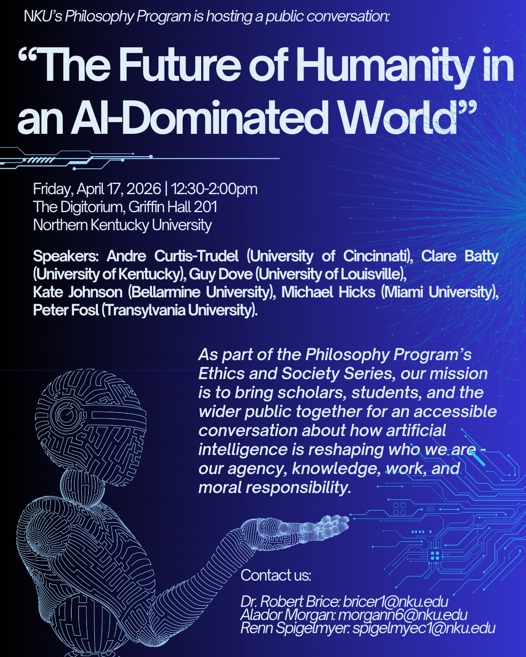 Northern Kentucky University’s Philosophy Program invites you to a timely and thought-provoking public conversation exploring how artificial intelligence is reshaping human life, knowledge, and responsibility.